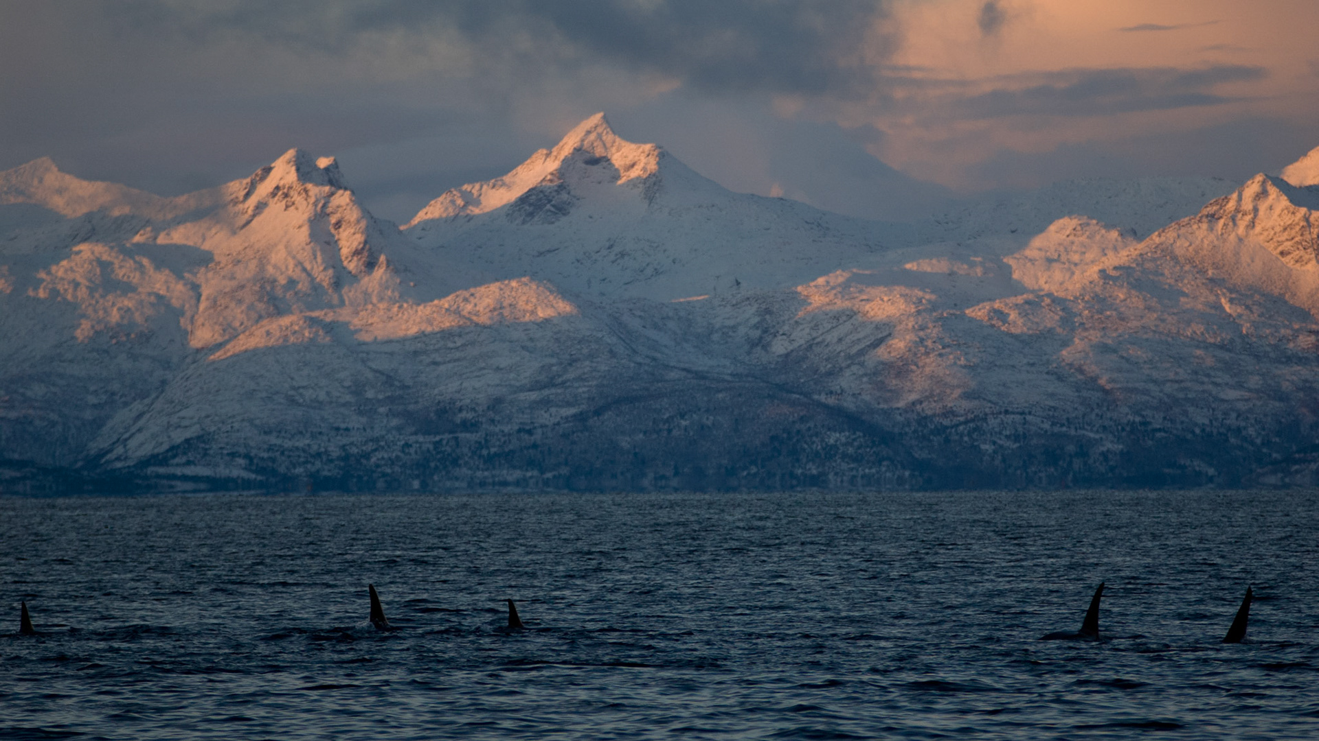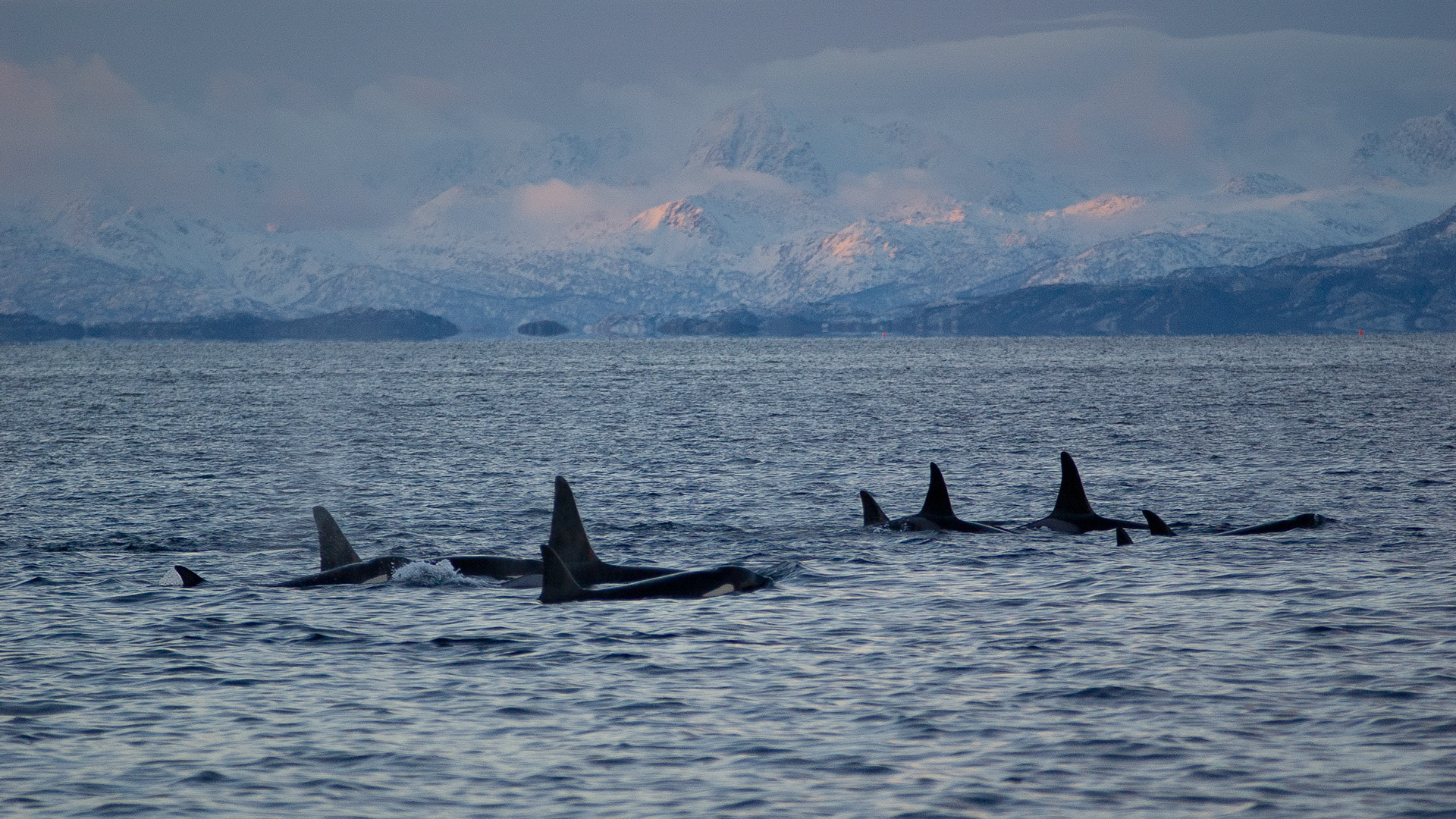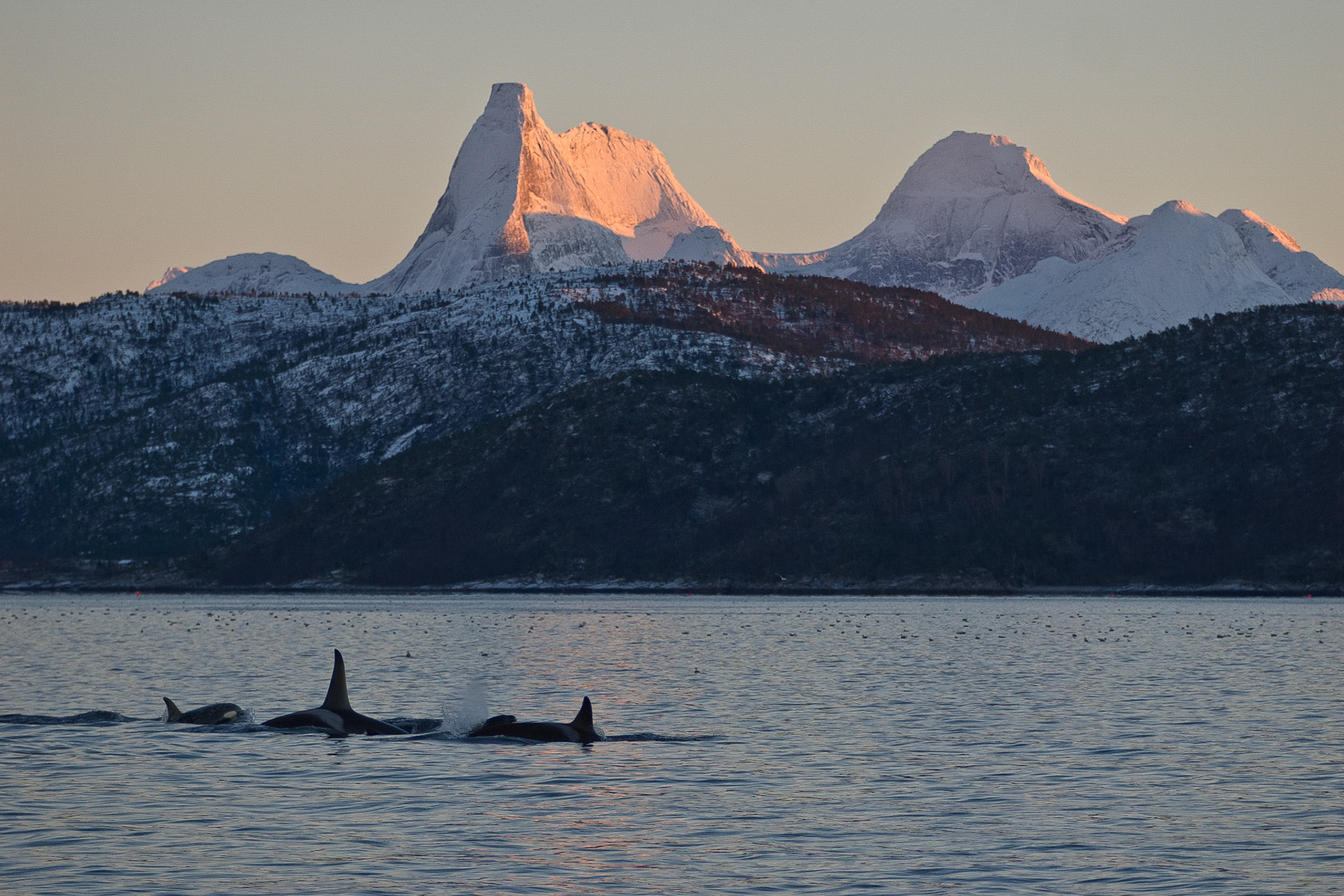 Orka's in Tysfjord in Noord-Noorwegen. Hier overwinterden tot 2007 veel haringen en dus ook orka's. Deze orka maakt een "spyhop" om de omgeving te verkennen.